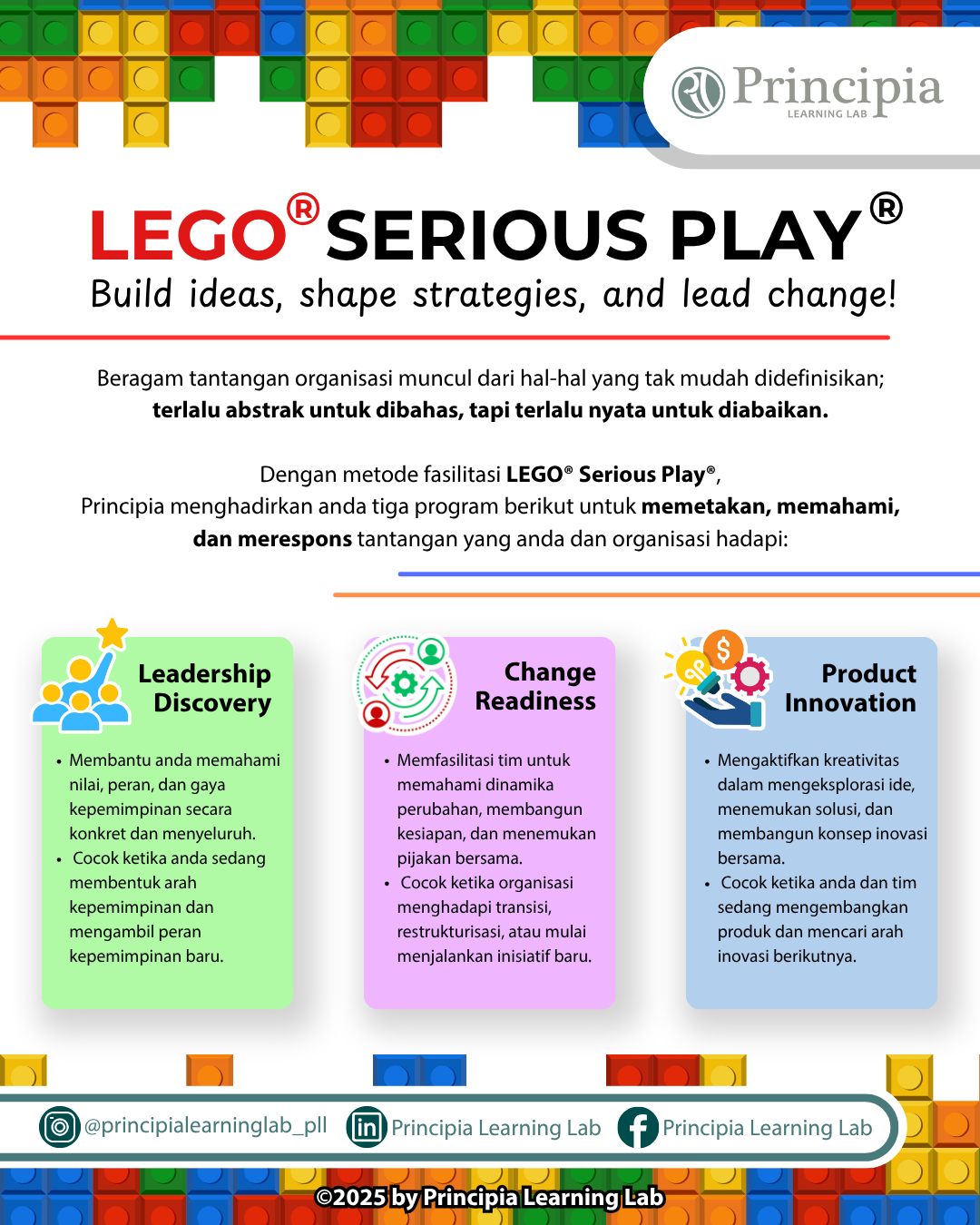 Berangkat dari pemahaman tersebut, Principia hadir dengan solusi-solusi yang dikemas secara apik dengan metode LEGO® SERIOUS PLAY®. Mari simak di bawah ini!